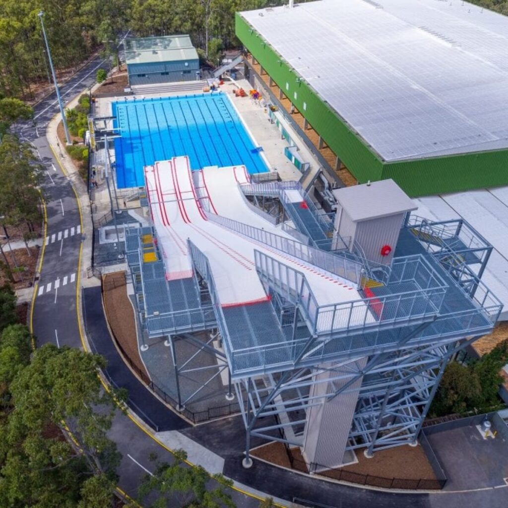 Located within the Sleeman Sports Complex in Brisbane, the Geoff Henke Olympic Winter training centre is a world-class facility, being the first of its kind in the southern hemisphere. This freestanding 289 tonne steel structure reaches 35m at its highest point and hosts seven jump profiles suitable for the various aerial disciplines ranging from moguls to slopestyle.